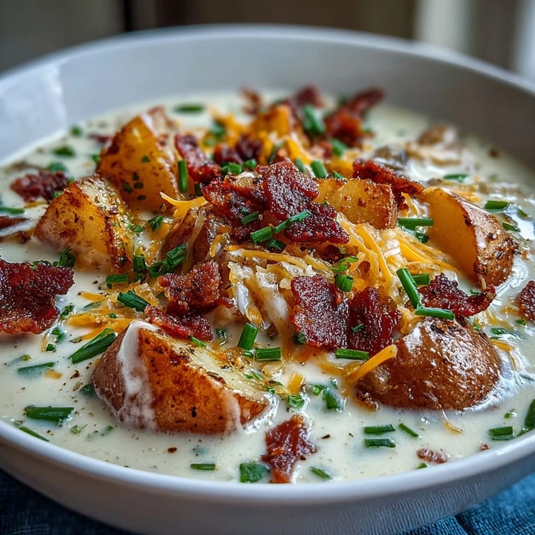 - Ladle into bowls and pile on the reserved bacon, extra cheddar, and fresh chives, which add color and a tiny sharp bite that cuts through all that richness. Crusty bread or toasted baguette slices on the side are non-negotiable.