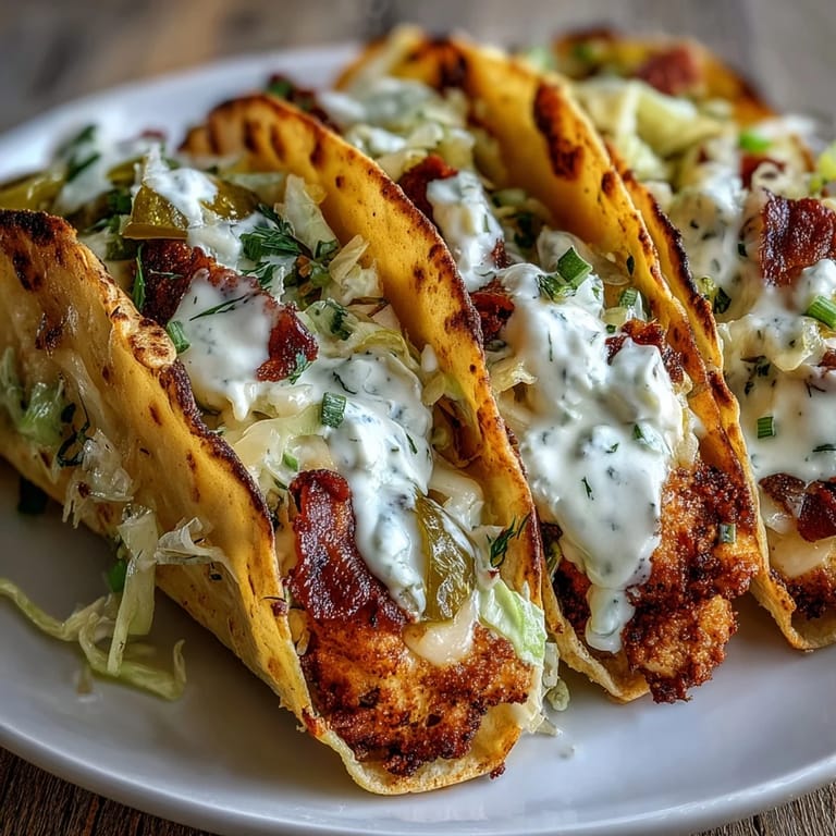 Save to Pinterest My kitchen smelled like pickle brine and melting cheese the afternoon I first assembled these tacos, a happy accident born from raiding my fridge while craving something tangy and crispy all at once. I'd been thinking about that addictive dill pickle ranch flavor combo for weeks, and suddenly there it was, coming together in a skillet with a sizzle that made my whole family pause mid-conversation. The cheese lace was the real game-changer—golden, delicate, almost lacy—turning an ordinary taco into something that felt a little bit fancy but tasted wonderfully casual.