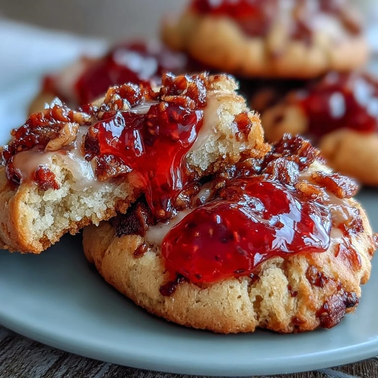 Save to Pinterest There's something about the smell of butter creaming with sugar that makes you feel like you're doing something important in the kitchen, even if you're just making cookies. My neighbor dropped by one afternoon with a basket of the most perfect strawberries, and I found myself wanting to do something more interesting than jam on toast. These thumbprint cookies happened almost by accident, born from that moment when you have good ingredients and a little time, and suddenly your kitchen smells like a bakery.