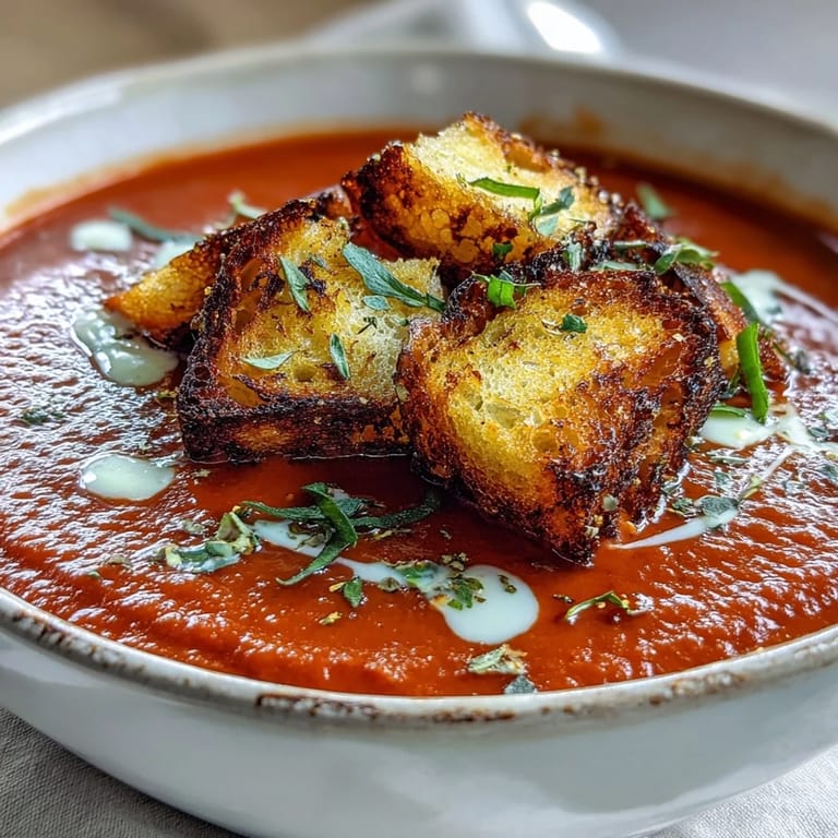 Save to Pinterest My kitchen smelled like a summer market the first time I charred red peppers under the broiler, watching their skins blister and bubble through the oven door. I was making this soup on a gray Tuesday afternoon, craving something bright and warm. The harissa I added was a gamble, a little jar I'd picked up months ago and forgotten about. When I tasted the finished soup, that smoky heat balanced perfectly with the sweetness of the peppers, and I knew I'd stumbled onto something worth repeating. The croutons were an afterthought, but they turned out to be the best part.