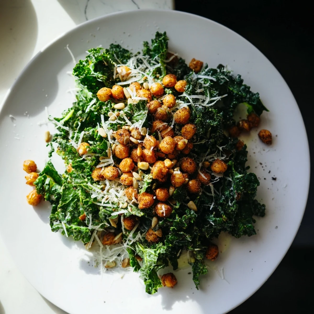 - Pour dressing over massaged kale and toss until every leaf glistens. Top with warm chickpeas right before serving so they stay crispy, and add seeds or cheese if you're in the mood.