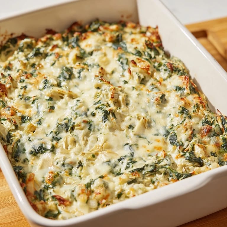 Save to Pinterest A creamy, cheesy dip loaded with tender spinach and artichoke hearts, perfect for serving warm with bread or crackers as a comforting appetizer.
