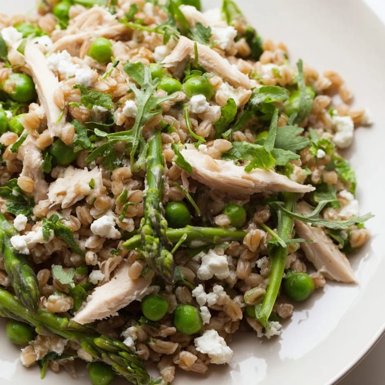 - In a large bowl combine the cooked farro sliced chicken blanched asparagus peas and arugula or spinach. Drizzle with the vinaigrette and toss gently until everything is lightly coated.