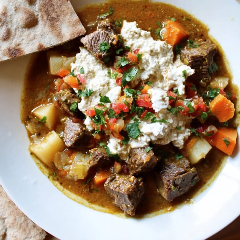 - Tear your flatbread into pieces and layer it in serving bowls, then ladle the hot stew over it so the bread soaks up the broth but still has some structure. Top with a generous spoonful of hulbah and serve immediately, letting people mix the layers as they eat.